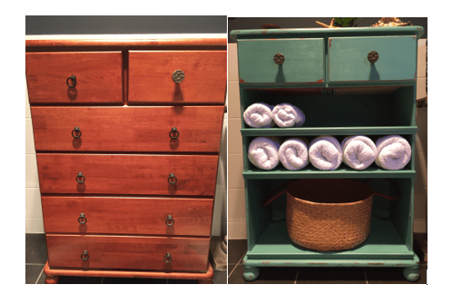 I removed the drawers and added MDF shelving to store towels and baskets. I also covered the front of the shelves with beading just to neaten the finish and then I set about painting.