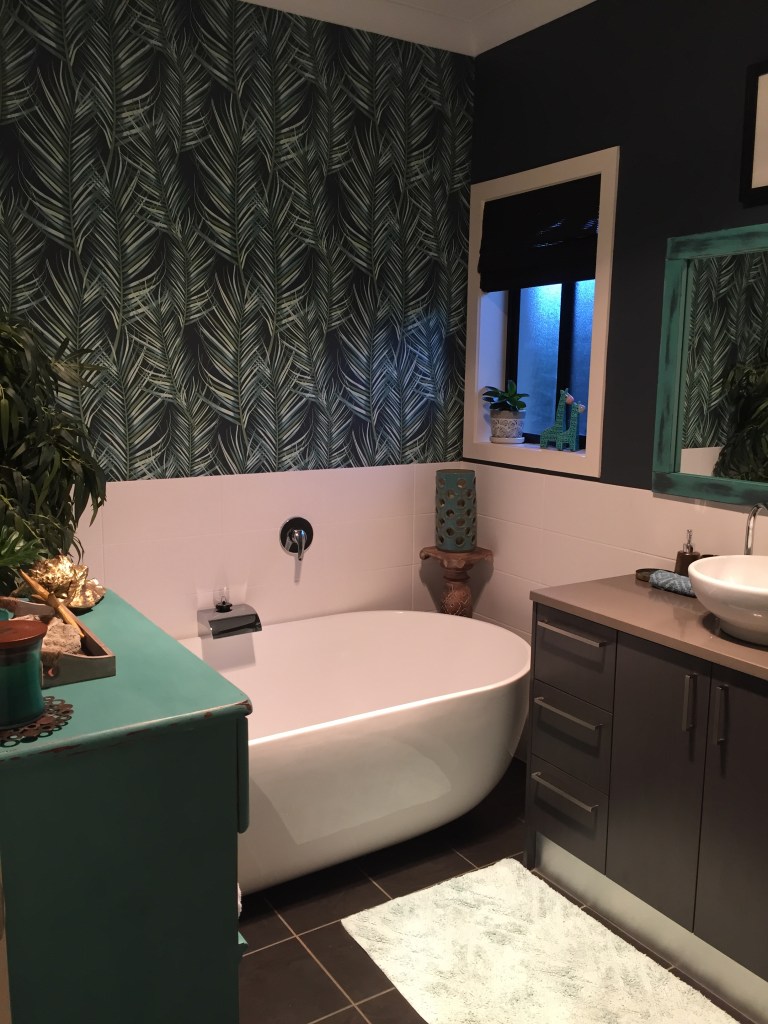 I am always on the lookout for décor in the sales and just before COVID I was in Bunnings and saw 3 rolls of wallpaper in the bargain bin. They were exactly what I had in mind to bring the tropics into my bathroom, so I bought just one roll. I always find that starting with one large item like a rug or in this case wallpaper really helps to decide on the wall colour. The wallpaper has a dark grey background, so I chose this as a paint colour for the wall which tied in with the floor. Being a dark colour also gives the room a cosier feel.