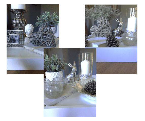 Here are 3 designs using the same objects I gathered. I have kept colours neutral to keep in style with the room décor. Utilising a white tray, I have placed items inside the tray using a book to raise smaller items. Reflective objects are utilised to bounce light and I have included candles to be lit in the evening.