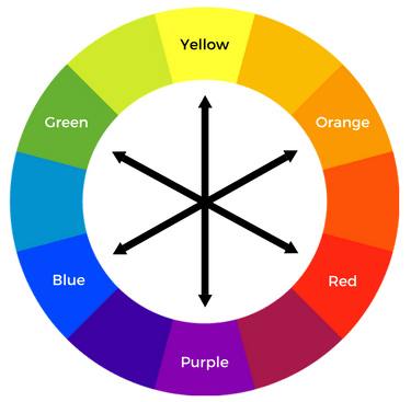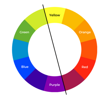 The classic colour wheel, as seen here is made up of 12 sections called hues (colours). This wheel can be divided in half with one side being the cool colours and the other being the warm. Reds, oranges and yellows are warm while greens, blues and purples are cool. You can literally strike a line through the middle of the circle to determine the cool and the warm.